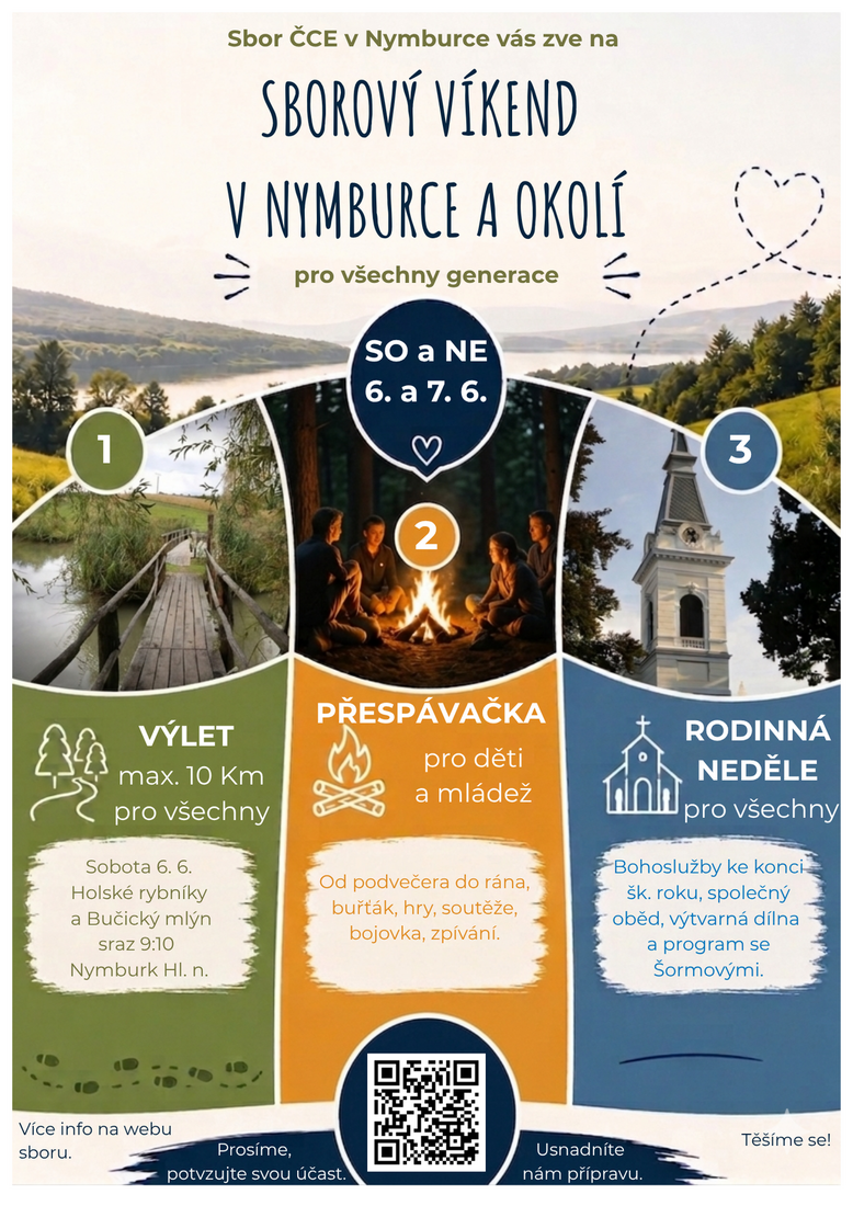Zveme všechny členy, přátelé a sympatizanty sboru na 3 akce ve dvou dnech, kterými zakončíme letošní školní rok o víkendu 6. - 7. června: výlet | přespávačka pro děti a mládež | rodinná neděle.